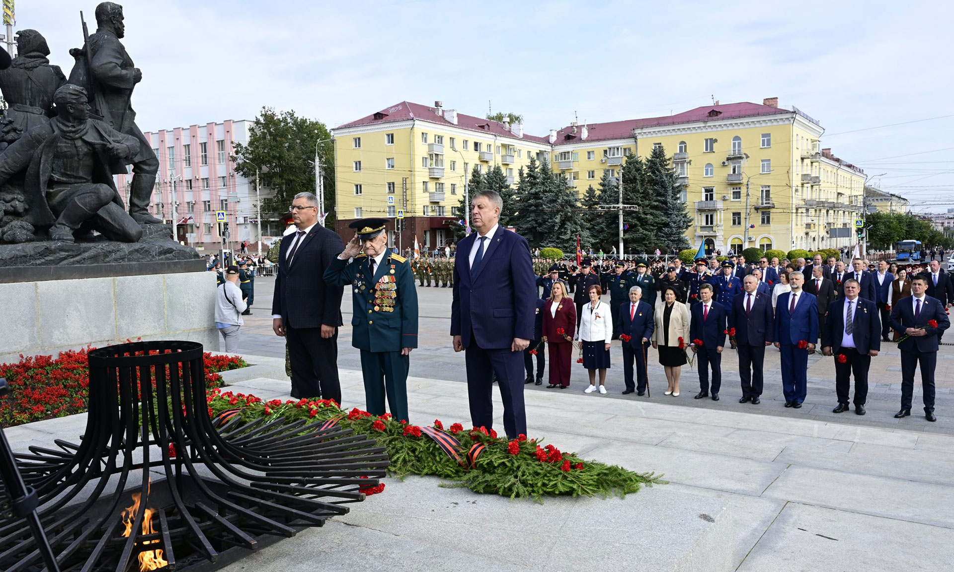 В знак памяти и благодарности воинам и партизанам, победителям в Великой Отечественной войне 1941–1945 годов, гирлянду и цветы к вечному огню памяти народной возложили Губернатор Брянской области Александр Богомаз, заместитель председателя Гомельского областного исполнительного комитета Андрей Барановский, ветеран Великой Отечественной войны, почётный гражданин города Брянска Борис Васильевич Шапошников, председатель Брянской областной Думы Валентин Суббот, главный федеральный инспектор по Брянской области Андрей Дьячук, сенаторы Российской Федерации Василий Попадайло и Вадим Деньгин, Герой Российской Федерации Александр Постоялко, участник СВО, кавалер трех орденов Мужества, участник президентской кадровой программы «Время героев», подполковник Евгений Вылцан, первый Губернатор Брянской области, почетный гражданин Брянской области Юрий Евгеньевич Лодкин, Герой Труда Брянской области Михаил Кабанов, мать Героя Российской Федерации, погибшего в Чечне офицера Олега Ермакова — Лидия Филипповна Ермакова, мать погибшего в Сирии офицера Федора Журавлева — Людмила Федоровна Журавлева, мать погибшего в специальной военной операции офицера Дмитрия Седнева — Марина Николаевна Седнева, руководители прокуратуры, правоохранительных органов и силовых структур, заместители Губернатора, руководители города Брянска, представители Брянской епархии, руководители органов исполнительной власти области, общественных организаций, жители города Брянска.