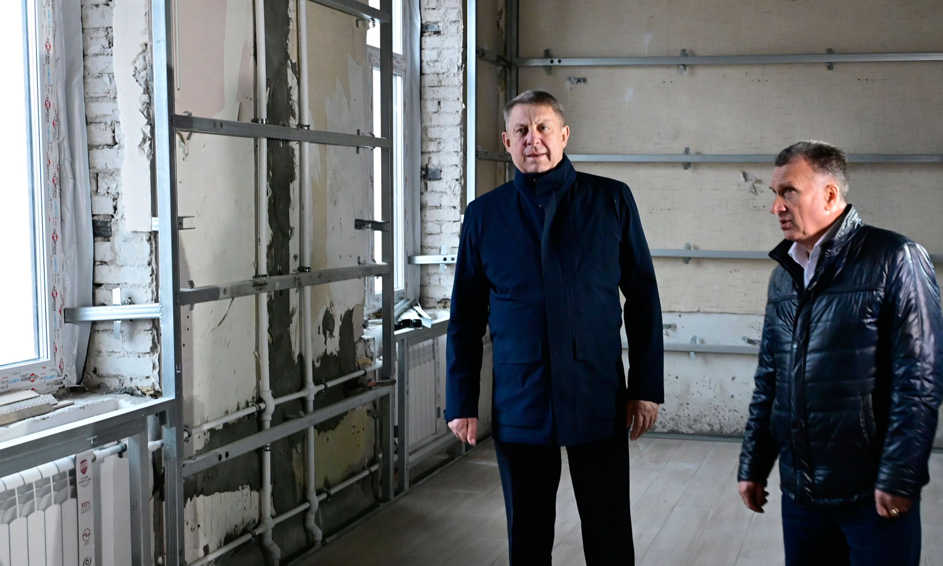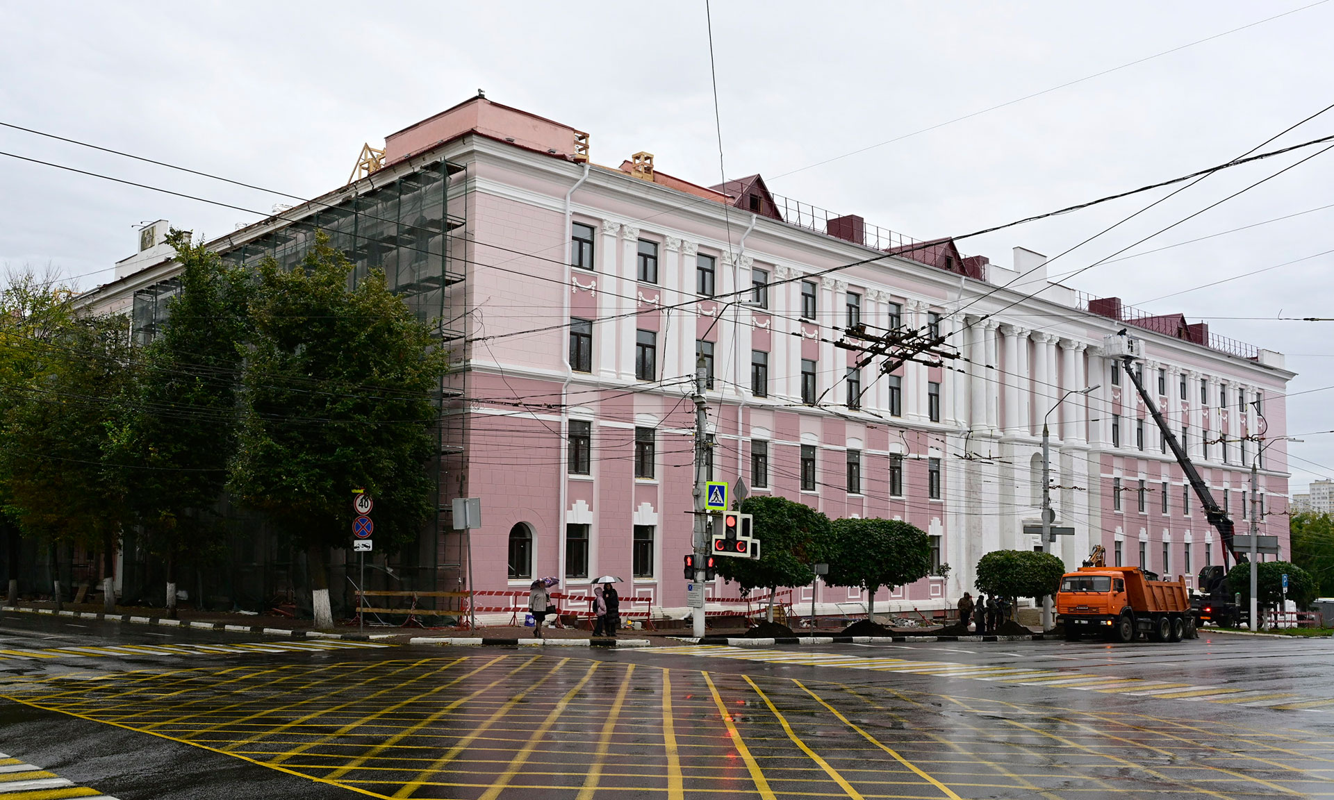 Во всем здании учебного корпуса идет чистовая отделка. Четвертый этаж уже через две недели будет готов — работы ведутся с верхних этажей здания. На всех этажах работают бригады в усиленном темпе. В декабре все четыре этажа планируется сдать, чтобы студенты уже могли заниматься в собственном здании.