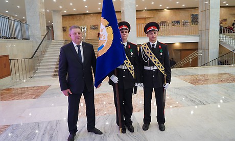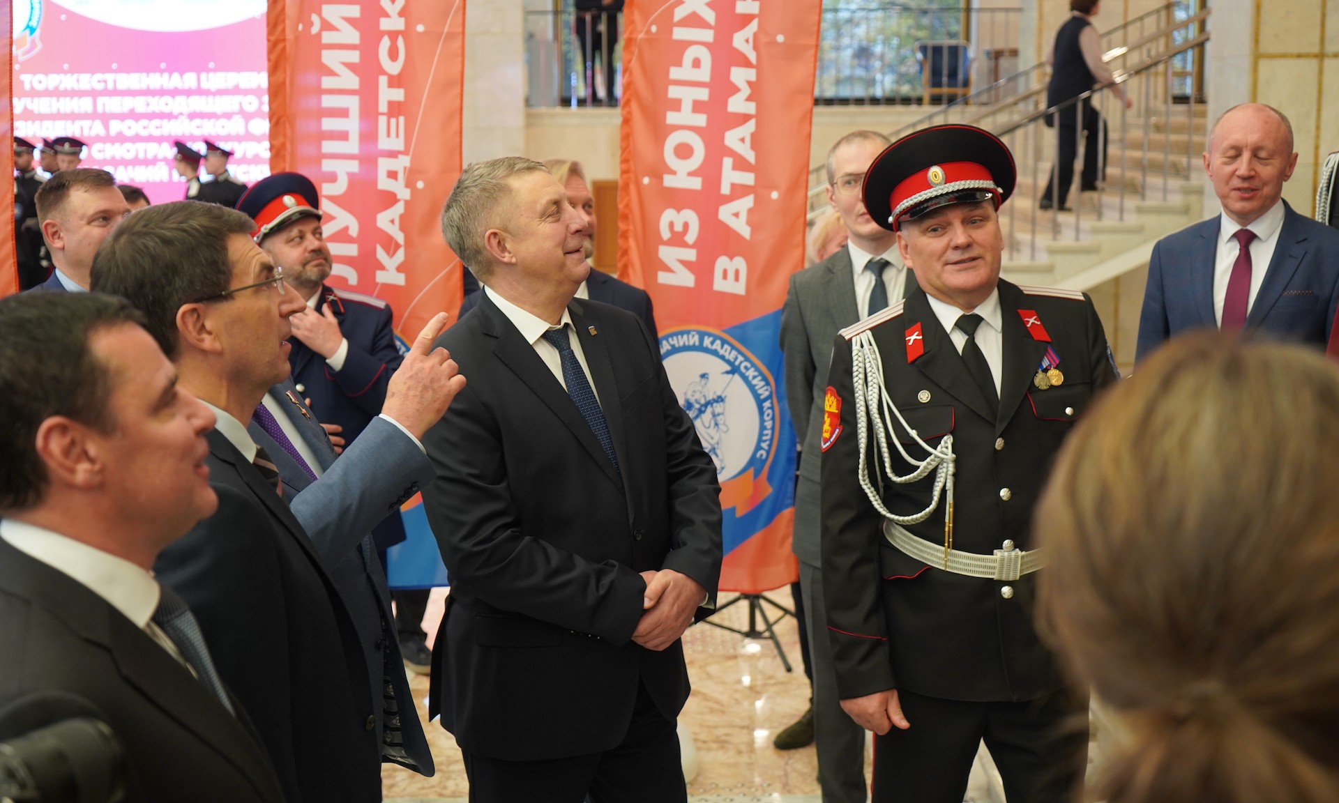 Приветствую всех на торжественной церемонии передачи переходящего знамени Президента Российской Федерации и поздравляю учащихся и преподавателей Стародубского казачьего кадетского корпуса с победой в смотре-конкурсе на звание «Лучший казачий кадетский корпус»!