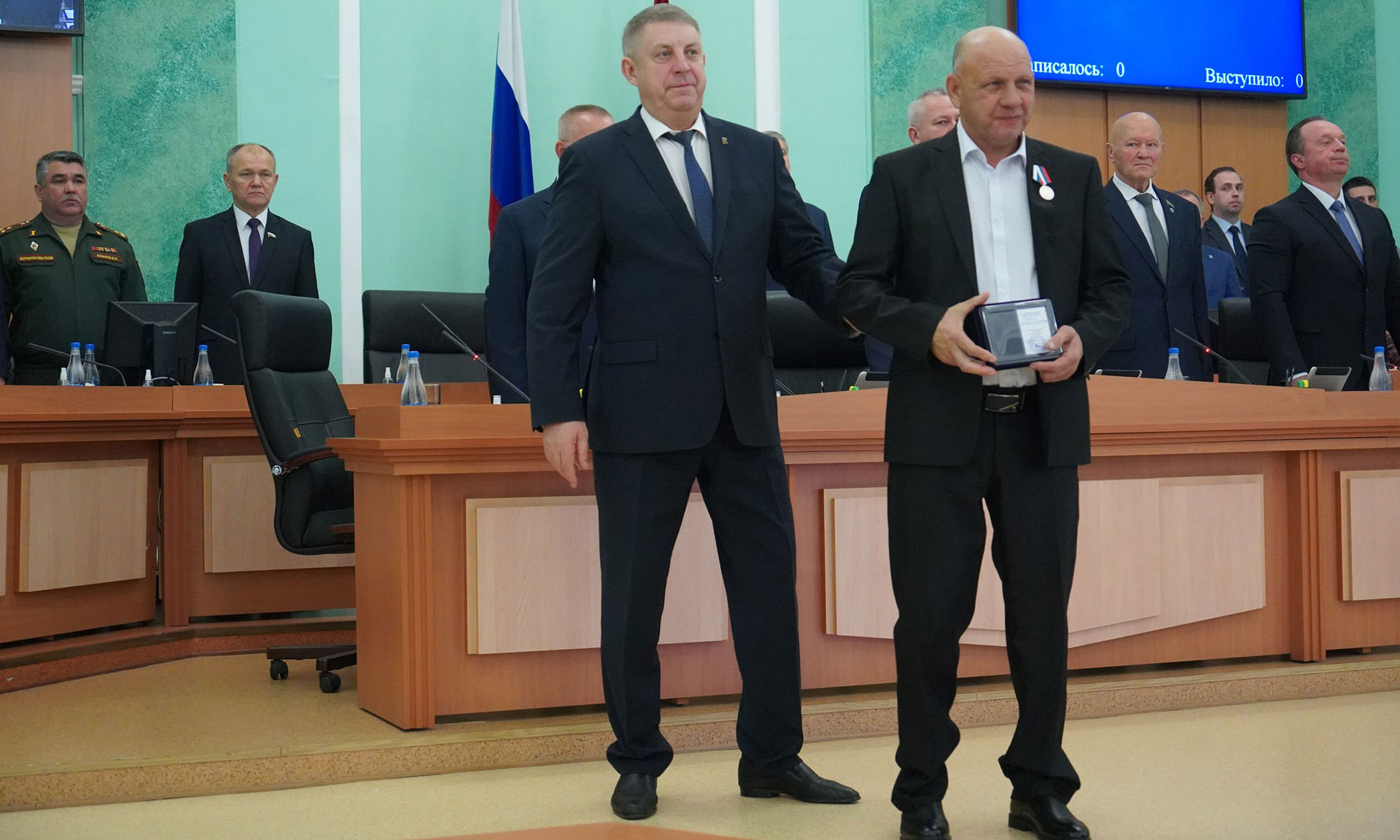 Перед обсуждением основной повестки заседания Александр Богомаз вручил родным Героев государственные награды. За мужество, отвагу и самоотверженность, проявленные при исполнении воинского долга, орденом Мужества посмертно награждены Александр Сергеевич Байдак, Александр Александрович Зубарь, Николай Михайлович Король, Илья Александрович Сиваков, медалью «За храбрость» II степени — Игорь Владимирович Пронин.