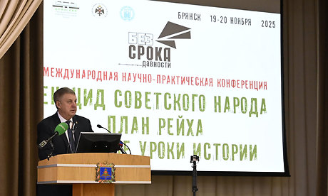 — Добрый день, уважаемые участники конференции! Прошло три года с момента проведения первой конференции, посвященной исторической правде о Великой Отечественной войне. И вот сегодня, в Год Защитника Отечества и 80-летия Великой Победы, мы вновь приветствуем на героической Брянской земле всех, кто исследует очень важную тему геноцида советского народа.